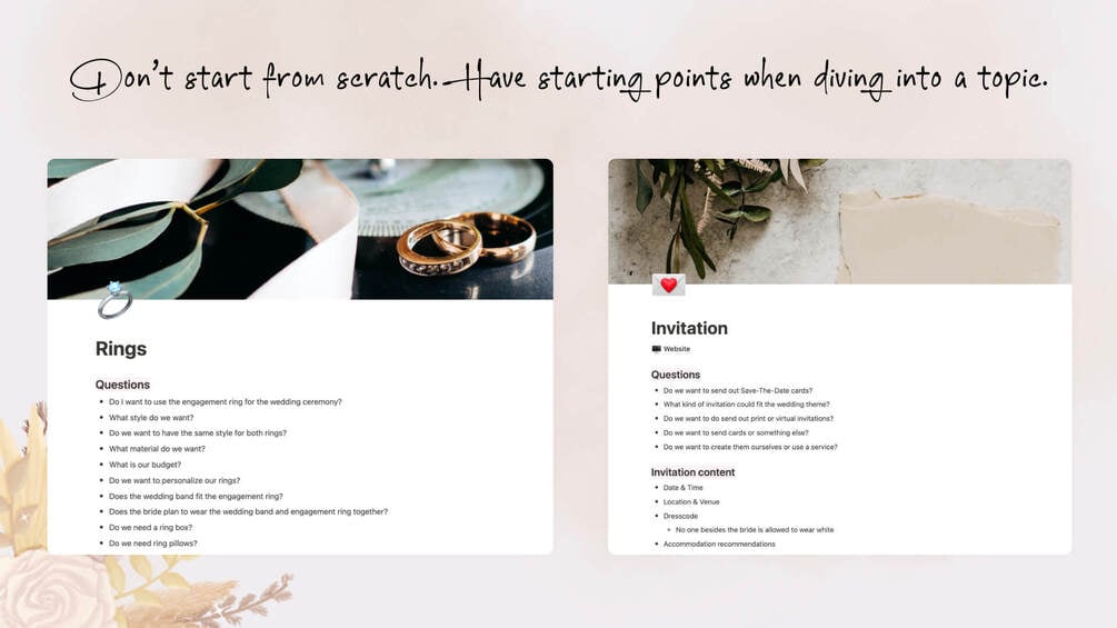 You do not need to start from scratch with your wedding planning and need to collect all the information. There is more flexibility to structure the content and embed media in a convenient way. Like playing music/videos right beside a todo.